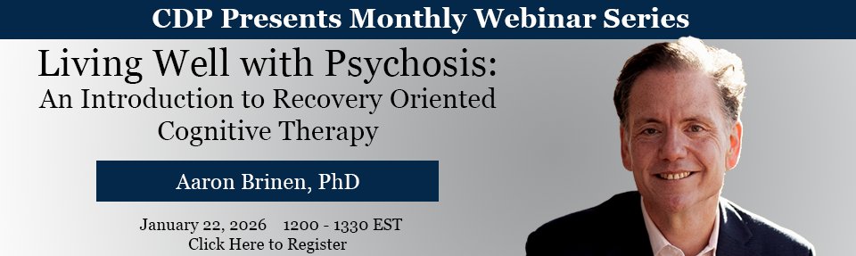 | Webinar Webinar | CDP Presents: Living Well with Psychosis - An Introduction to Recovery Oriented Cognitive Therapy via Zoom, 22 January 2026 | Jan 22 | Webinar | Details |