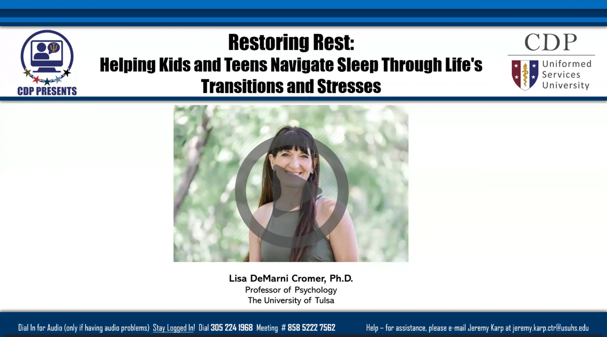 In this 90-minute webinar, participants will learn more about evidence-based sleep interventions and their potential applications for improving sleep health in youth ages 6-17. The session will explore the impact of poor sleep and nightmares on psychological well-being and development, as well as strategies for adapting sleep interventions to meet the unique needs of children and adolescents. Additionally, the session will present a model for understanding the mechanisms through which sleep interventions may enhance emotional regulation during transitions (e.g., a parent’s deployment) or stressful times (e.g., holidays). Participants will also review research findings on sleep interventions when there are co-occurring mental health concerns. Attendees will leave with practical knowledge of effective adaptations of sleep interventions for youth to implement successfully into clinical practice.