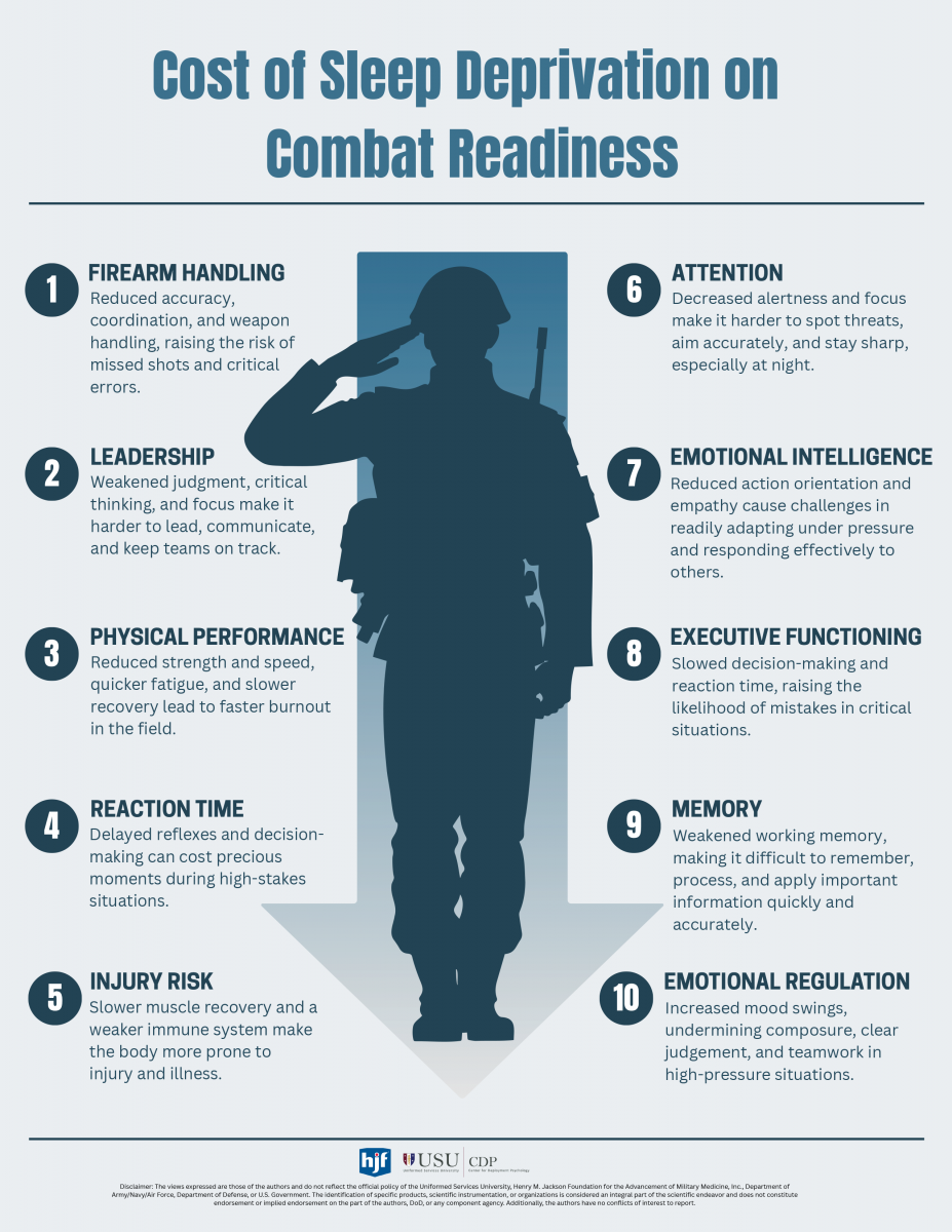 The report defines sleep deprivation as “inadequate sleep that negatively impacts a service member’s military effectiveness, evidenced by a reduced ability to execute complex cognitive tasks, communicate effectively, quickly make appropriate decisions, maintain vigilance, and sustain a level of alertness required to carry out assigned duties” (Department of Defense, 2021). A recent review by Rodden et al. (2026) on the impact of sleep deprivation on combat readiness supports the DoD’s definition and created an infographic to summarize key findings from the literature (See figure 1). Prevalence estimates for sleep deprivation among service members were roughly twice as high compared to civilian populations, with 64% reporting getting less than seven hours of sleep per night.